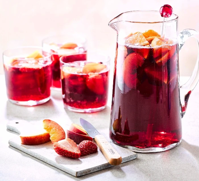 Sangria is a punch that traditionally consists of wine, chopped fruit and a mixer (usually lemonade, orange juice or sparkling water) as well as other ingredients such as liqueurs and spirits.